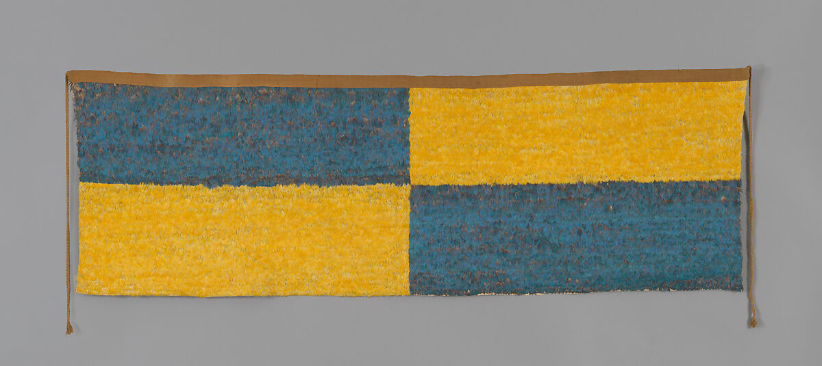 The panels are of roughly similar dimensions, and the majority feature alternating rectangles of blue and yellow feathers, which came from the macaw’s dorsal and ventral sides, respectively. The panels have a woven heading tape, and most also include braided cords that hang from the narrow sides. Although the cords suggest that these works were meant to be secured to some kind of structure, their actual function remains frustratingly elusive.
