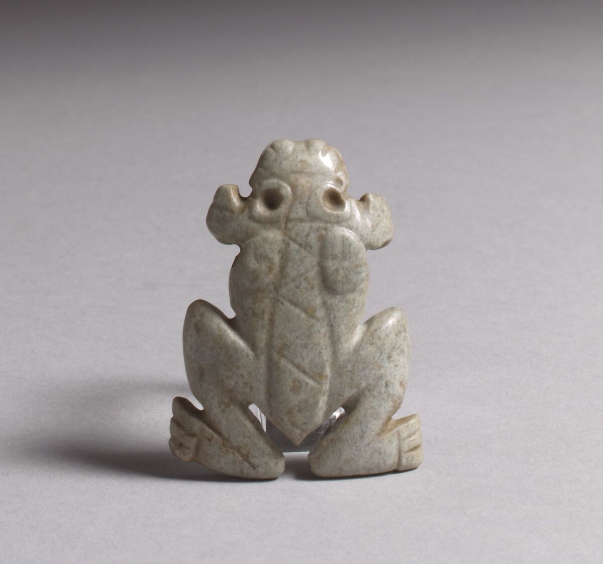 The color of Mesoamerican jade, often called greenstone, ranges from a near white to a deep blue green. Associations with water, plant life, and thus fertility caused jade to be prized above all other materials in Mesoamerica. This carved pendant of light green jade flecked with white reinforces the symbolism of water with its amphibian subject. The frog presents a realistically rendered anatomy, including poison glands on top of the head behind the eyes, combined with the abstract details of a zigzag motif down the spine and the goggled eyes. The pendant was strung through a drilled hole on the sides of the abdomen just behind the front legs.