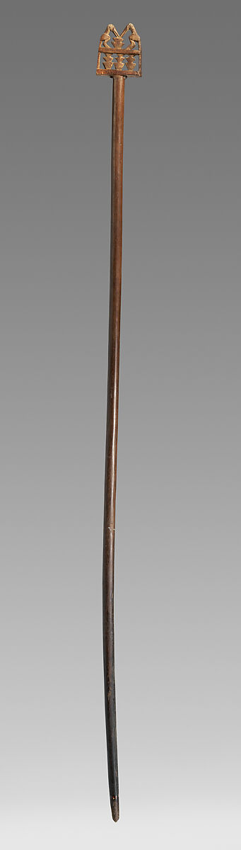 Surmounted by carved figures that were likely once painted in red, this wood implement made by Inca artists is thought to have served as a funerary marker. The need to indicate specific burials on the desert coast of the Andes was important not only to remember the dead, but to locate them in preparation for periodic community celebrations when the bundles—the human body wrapped in fine garments and accompanied by ornaments and other items—would be disinterred to feature in elaborate processions celebrating them as ancestors.