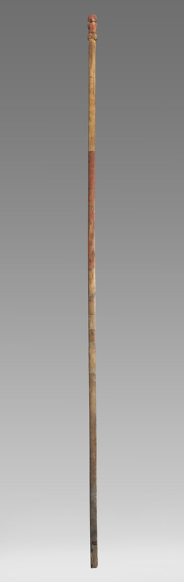 Surmounted by a carved figure that was likely once painted in red, this wood implement made by Inca artists is thought to have served as a funerary marker. The need to indicate specific burials on the desert coast of the Andes was important not only to remember the dead, but to locate them in preparation for periodic community celebrations when the bundles—the human body wrapped in fine garments and accompanied by ornaments and other items—would be disinterred to feature in elaborate processions celebrating them as ancestors.