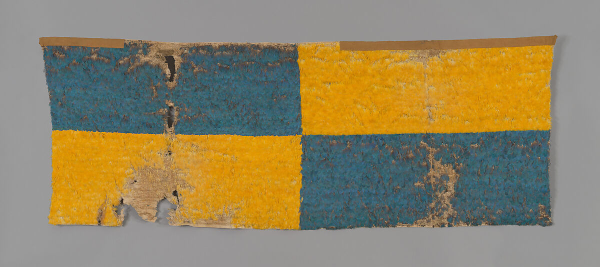 The panels are of roughly similar dimensions, and the majority feature alternating rectangles of blue and yellow feathers, which came from the macaw’s dorsal and ventral sides, respectively. The panels have a woven heading tape, and most also include braided cords that hang from the narrow sides. Although the cords suggest that these works were meant to be secured to some kind of structure, their actual function remains frustratingly elusive.