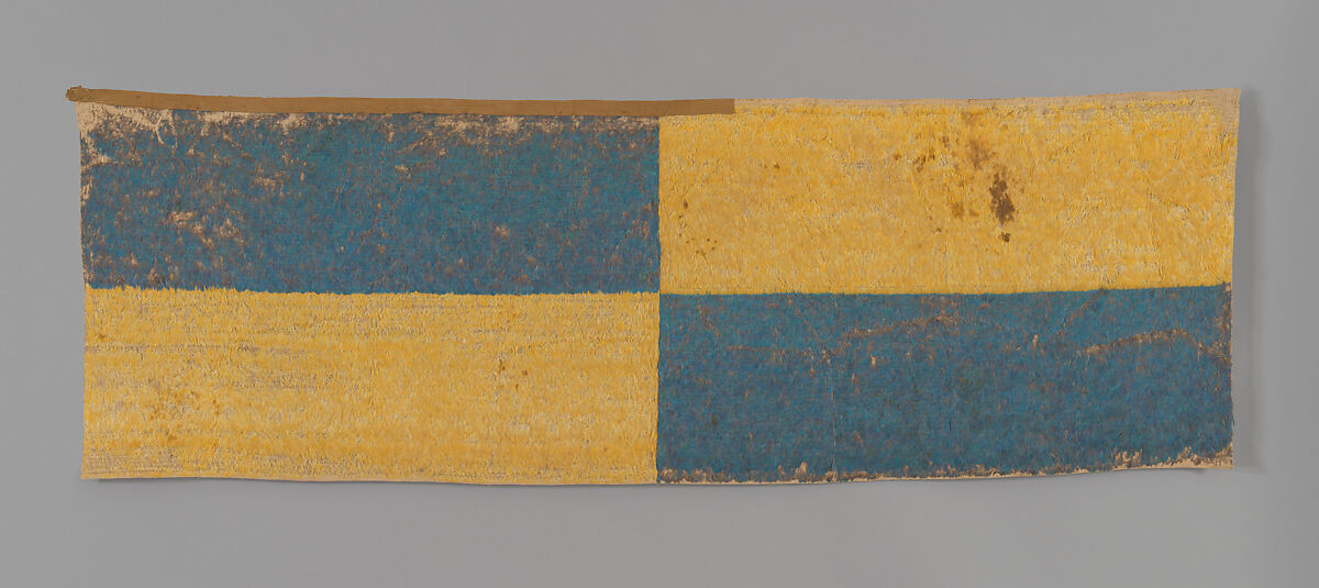 The panels are of roughly similar dimensions, and the majority feature alternating rectangles of blue and yellow feathers, which came from the macaw’s dorsal and ventral sides, respectively. The panels have a woven heading tape, and most also include braided cords that hang from the narrow sides. Although the cords suggest that these works were meant to be secured to some kind of structure, their actual function remains frustratingly elusive.