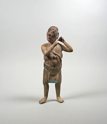 This figurine is in the Jaina style, named after a small island off the coast of Campeche, Mexico. Jaina was a Maya center occupied from the Late Preclassic period (ca. 300 BCE–250 CE) to the Late Postclassic period (ca. 1200–1500 CE), with a peak population in the Late Classic (ca. 600–800 CE) and Terminal Classic (ca. 800–900 CE) periods. A large number of figurines and anthropomorphic whistles similar to this one have been recovered from the island. Like this example, figurines from Jaina are mold made, with individual details added by hand. They depict a variety of subjects, from seated young women to warriors to anthropomorphic beings. While many of these artifacts lack archaeological context, excavations have recovered figurines in the burials of adults and infants. Although this style of figurine is closely associated with Jaina Island, source testing of ceramic material in other museum collections indicates that Jaina-style figurines may have been produced and traded throughout Veracruz, Tabasco, Campeche, and Chiapas, Mexico.
