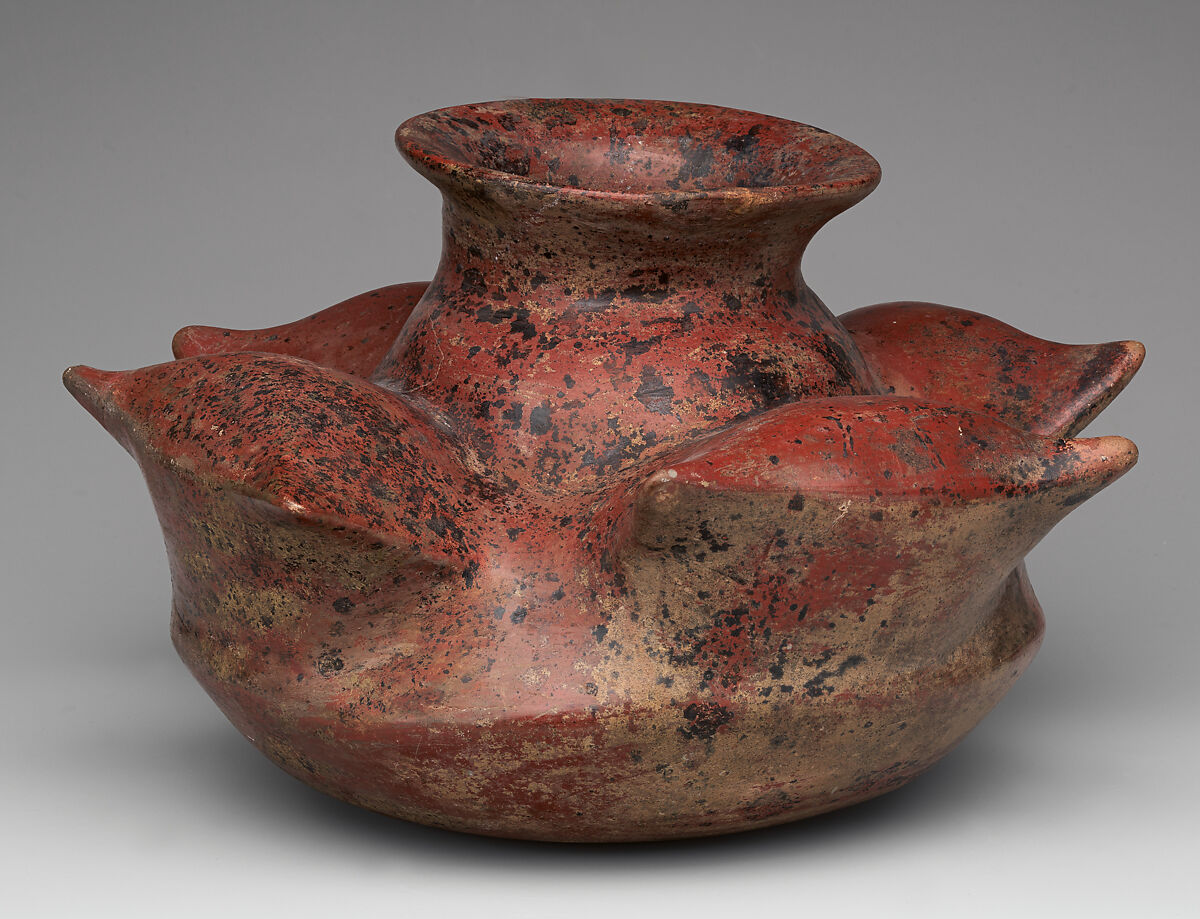 Like other ceramic objects from Colima, the subject matter of this vessel was taken directly from the imagery of daily life. The four projecting elements of this pot are representations of a regional food staple, the succulent base of the maguey agave cactus leaf that even today is roasted and sold in the local markets of western Mexico, the area from which this jar came. Other Colima vessels of this type depict piles of fruits and vegetables, such as zapotes and squashes. All are characterized by simple, elegant motifs rendered three-dimensionally and presented in repetition. These ceramics have been found in burial contexts and their shape suggests that they would have held a liquid, perhaps one derived from the object that they depict. In this vessel, the roasted cactus, called mescal, like the fermented beverage produced by it, is depicted as if set in a bowl ready for consumption.