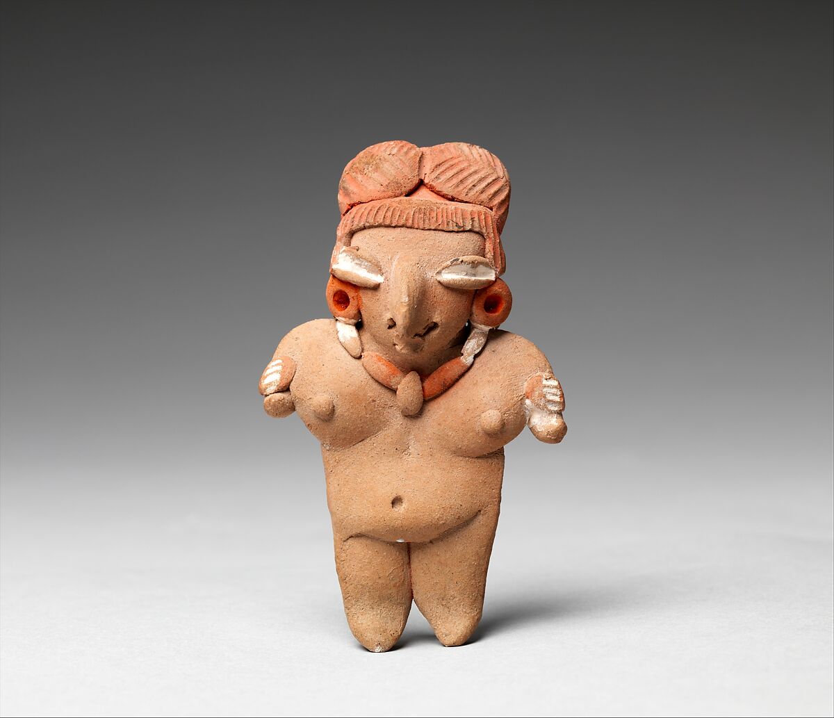 This ceramic figurine features a stylized female, nude except for a beaded necklace and rounded earflares, a nose ornament, arm ornaments, and an elaborate coiffure. Hand-modeled, figurines of this type are often female and come in a variety of styles displaying regional characteristics such as the coffee-bean eyes typical of figurines from Chupícuaro. Potters emphasized the faces and heads of these figures while often minimally indicating the bodies, yet it was important to gender the figurines as female by indicating the genitalia. Small ceramic figurines were made by most ancient peoples in Mesoamerica from as early as the second millennium BCE to the time of the Aztec in the early sixteenth century. They were placed as funerary offerings in burials or in other dedicatory assemblages. Some link the figurines to fertility cults; others view them as companions for the deceased.