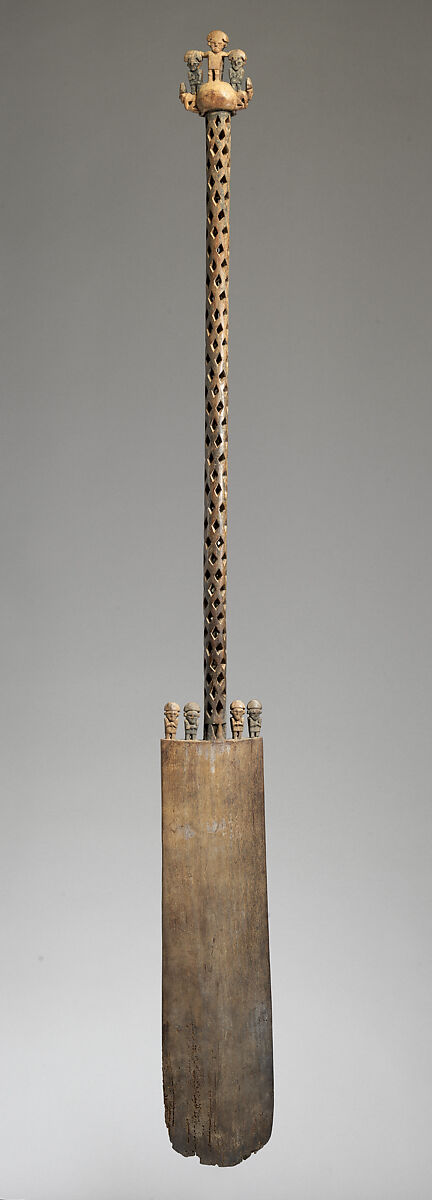 This imposing sculpted board, made from algarrobo wood (Prosopis chilensis), features a plain lower third terminating in a rounded, paddle-like lower edge. The shaft linking the lower section with the figures at the top of the implement was intricately carved to form a hollow three-dimensional lattice or openwork diamond pattern. The shaft is surmounted by a bulbous mound on which stand five figures; the central figure has a hand on head of the two figures flanking him. The flanking figures, in turn, stand with one foot on the backs of crouching figures carved perpendicular to the mound and facing outward. Two pairs of standing figures were carved on either side of the lower end of the shaft, at the top of the paddle. All figures but the one at the top center hold a cup to their chests. The front and back sides of the implement are identical with figures carved back to back. Traces of pigment and small fragments of metal remain in certain regions, suggesting that the implement was once highly embellished with paint and silver sheet (see also MMA accession number 1979.206.1025 and 1979.206.1028).
