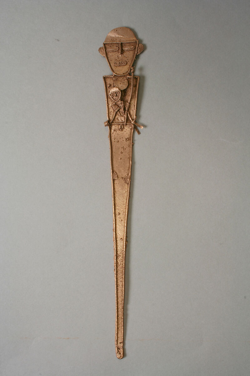 This tunjo depicts a female figure holding a smaller one, possibly a child, in one hand and a baton on the other. A long, multistrand necklace is on her chest and a prominent disk-shaped pectoral under her chin. Her small feet, worked as a series of fine gold threads, appear in the upper half of the tall plaque.