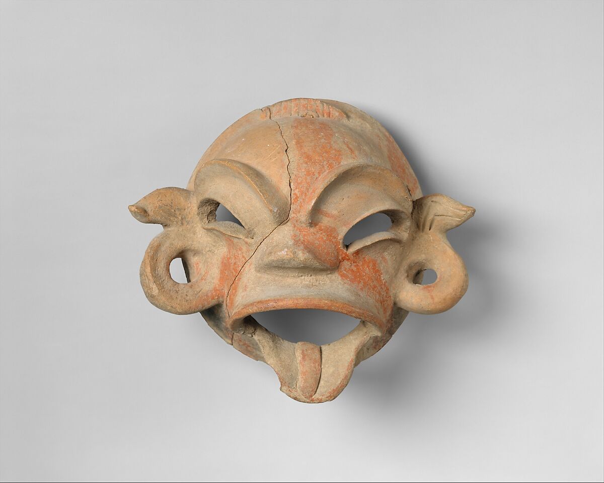 Masks in ancient Mexico came in all shapes and sizes and ranged from those that clearly depict human faces to those that appear bizarre and/or supernatural. This mask, stylistically associated with the site of Tlatilco in the Basin of Mexico, shows a twisted, simianlike face with simple, serpentine curves for ears, bulging eyesockets with crisply outlined eyelids, and exaggeratedly prominent eyebrows. While the eyes and mouth are pierced, the mask is too small to have covered the entire face. Paired holes at the temples and below the ears suggest that it could have been tied on the lower face or onto a bundle or sculpture, thereby representing a state of transformation.