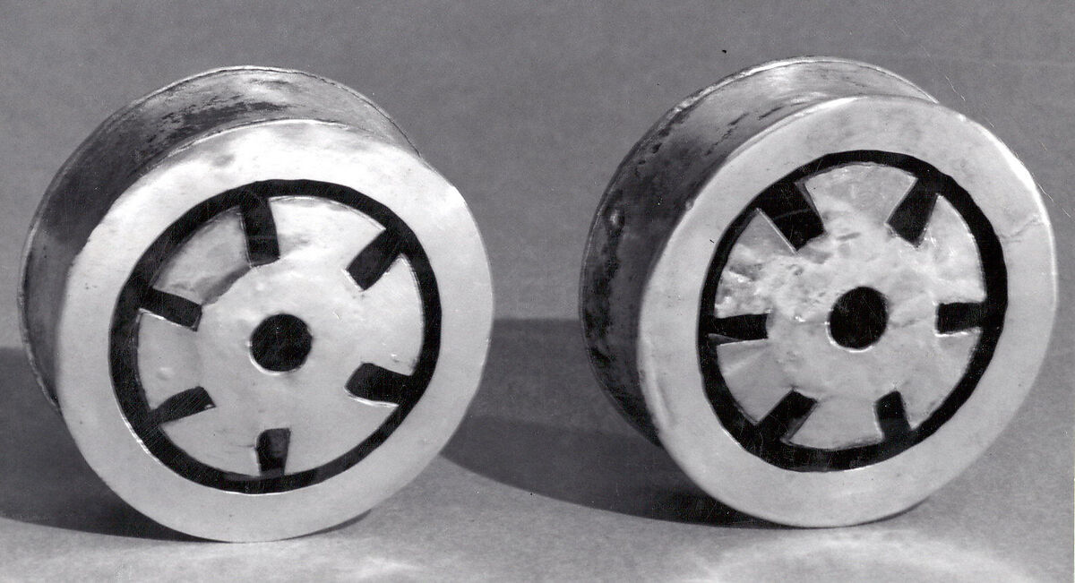 Ear ornaments were worn by prominent personages of both sexes in many cultures in ancient Peru. Among the Inka, only noblemen wore such ornaments; their substantially distended earlobes led the Spanish to call them orejones (big ears). Since the Spanish melted down all the gold and silver jewelry that came into their hands, little Inka precious metalwork survives. These rare ornaments are spool-shaped and have curved-in sides for better placement in the earlobes; they have gold outlays.