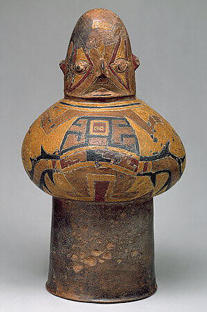 Music was an integral part of daily and ceremonial life in ancient Peru. Essential to religious and political celebrations, it was also performed for entertainment and recreation and accompanied herding and work in the fields. Songs served to tell myths and history. Andean music was played on percussion instruments such as drums and wind instruments including whistles, panpipes, flutes, and trumpets. Ceramic drums with central bulbous sounding chambers were made by Peru's southern coastal peoples during the last few centuries before the Christian era. On this remarkable example, which still preserves much of the original resin paint, a frontal, rotund body of a human figure is depicted. Outstretched, spindly arms extend horizontally on the bulging chamber and broad, snakelike streamers emanate from the figure's waist. They encircle the drum and may denote a supernatural connection. The head is cone-shaped and has modeled, slightly protruding eyes, ears, and nose. The figure sits atop the tall, wide mouth of the drum, over which a skin would have been stretched to provide a striking surface. When played, the drum would have been inverted.