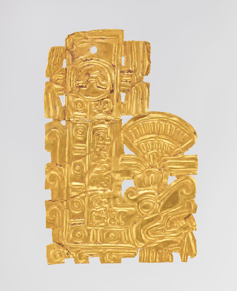 Through interviews conducted with informants who once worked as moneros or looters, these objects have been tentatively traced back to an ancient cemetery at the site of El Chanal in the West Mexican state of Colima (Kelly 1980, 1985). Metallurgy (both repoussé and lost wax techniques) had flourished in West Mexico for centuries prior to the creation of these ornaments. Their style, however, does not represent work typically created in this region; instead, the iconography aligns closely with that created by Mixtec artists, while similarly perforated gold sheet ornaments have been found in Mexica (Aztec) contexts, including the Templo Mayor at Tenochtitlan. These incongruencies speak to their likely role as trade objects in the Postclassic Period. Long-established and closely overseen trade routes would have ferried gold dust from various parts of Mesoamerica to the heart of the Mexica empire, where artists would have created gold ornaments that would then be redistributed, sold, and traded throughout the region.