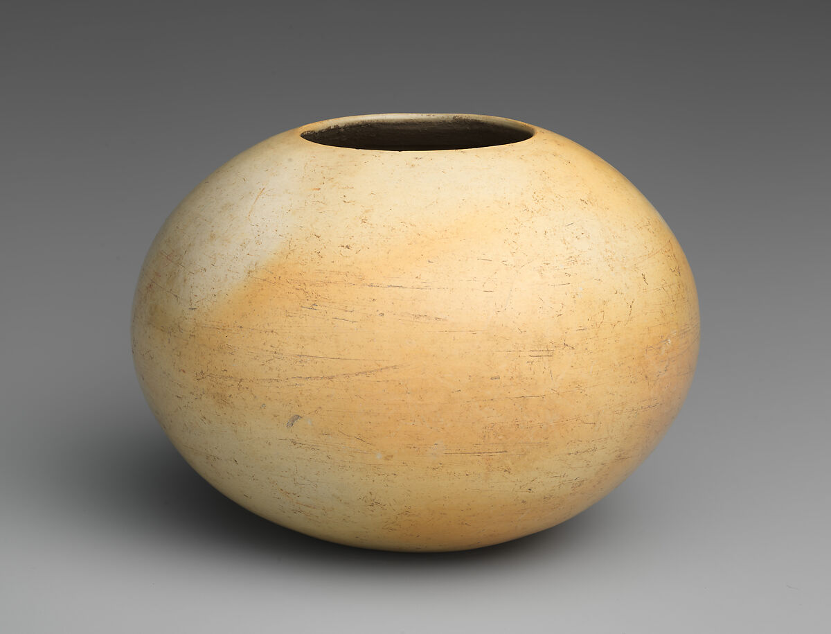 This bowl, reportedly from the site of Tlatilco, Mexico, is in a full, round shape with a small opening at the top. Made of a kaolin-like clay, its undecorated walls are thin and burnished to a high gloss.