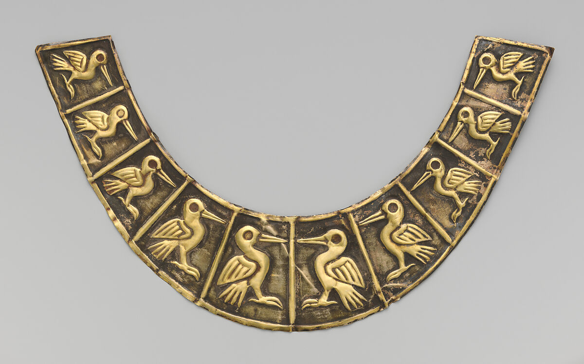 Originally the outer part of a crescent-shaped nose ornament, the larger base of the ornament—likely made of silver sheet—has not survived (see MMA accession number 1979.206.1228 for a more complete example). This band was cut from a hammered gold sheet and ten profile birds facing inward were worked from behind (repoussé). Each bird stands within a trapezoid space bordered by raised edges. The ornament was then silvered; the silver on the elevated design was removed by abrasion. The gold band would have been joined to a silver backing by small tabs (Schorsch, 1998: 125). The birds’ eyes were likely inlaid with shell or stone.