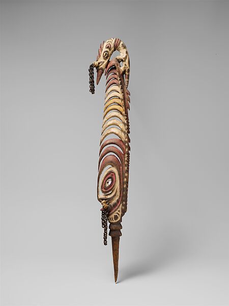Among the Biwat on the Yuat River, a tributary of the lower Sepik River in Papua New Guinea, hair ornaments (manyan) are one of the many accoutrements worn my adult men during ceremonies. The pointed end would have been tucked into the hair, but similar ornaments were attached to arm bands, belts, and flutes. This manyan is painted in a striking combination of white and red and is further embellished with two fiber chains at the top and bottom. Near the center of the carving, a face emerges where a bright shell forms the eye. A small hole underneath forms a nose pierced with shell or bone ornaments. An animal-like figure sits perched at the top, with four legs planted underneath a thin body. The long tail and head bend downward to mirror the concentric, curving forms that dominate the rest of the structure. These hook-like shapes are strikingly similar to carvings (1978.412.854 & 1978.412.732) produced by the Yimam on the nearby Korewori River (sometimes spelled Karawari). Communities across the Sepik are linked by extensive trade networks, and visual forms such as this demonstrate the dynamic movement, exchange, and innovation of artistic styles in the region.