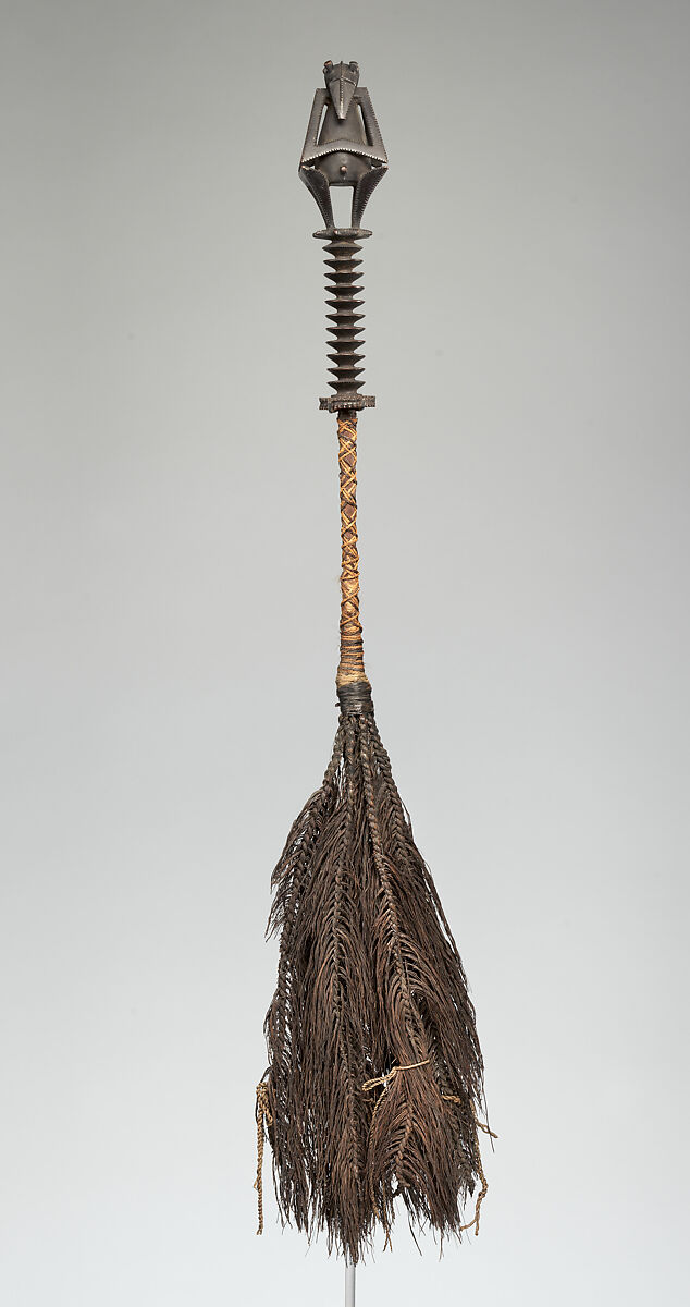 KATERINA TEAIWA: In the past, missionaries and scholars referred to these objects as “fly whisks,” and assumed they were used to keep flies off food. But look at the central shaft, which is wrapped with both light-colored coconut fiber and darker human hair.