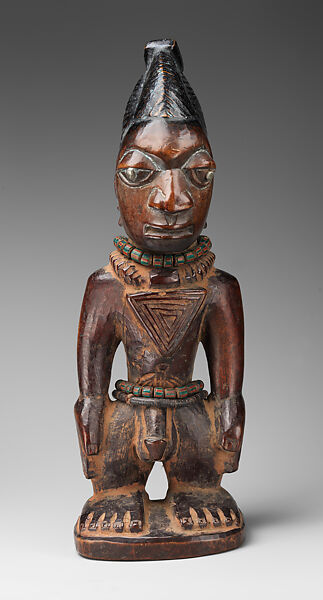 Yoruba peoples have one of the highest incidents of twin births in the world. As a result, twins are regarded as extraordinary beings protected by Sango, the deity of thunder. They are believed to be capable of bestowing immense wealth upon their families or misfortune to those who do not honor them. Powerful spirits in life, twins are honored with carved memorial figures when they die. These figures, known as ere ibeji (literally meaning ere: sacred image; ibi: born; eji: two), remain a point of access to the spirit of the departed individual. The mother provides ritual care to the figures, bathing, dressing, adorning, and feeding them. Such daily handling is responsible for giving their surface its distinctive patina. Ere ibeji invariably represent their subjects with mature adult physiognomies, and are often crowned with elaborate hairdos.