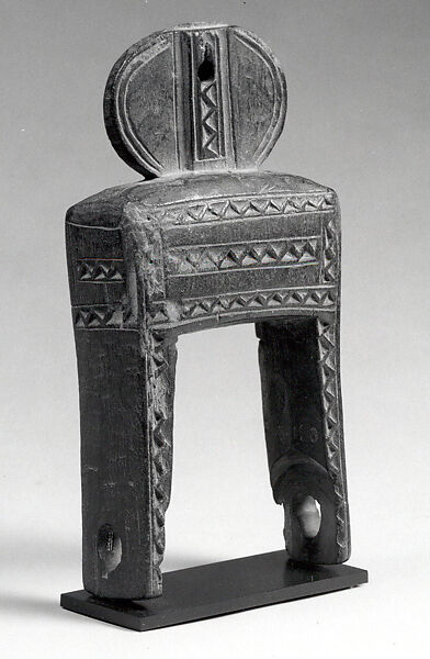 Baule peoples and their neighbors to the West, the Guro, are famous as weavers, and are known for their fine indigo-and-white cotton fabrics. Used on the traditional narrow-band loom, heddle pulleys are functional objects used to ease the movements of the heddles while separating the warp threads and allowing the shuttle to seamlessly pass through the layers of thread. Like many other carved objects used in everyday activities among the Baule, these pulleys were often embellished for the weaver’s delight. Scholars have suggested that the prominent display of pulleys, hanging over the weaver’s loom in the public place, afforded artists their best opportunity to showcase their carving skills, in the hope to attract commissions for figures and masks. The use of abstract design in this example is reminiscent of Akan gold beads and gold weights. This pulley demonstrates the efforts put by Baule carvers into beautifying the simplest functional object.