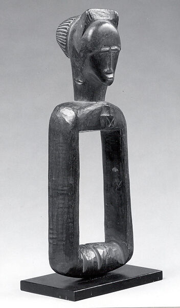 Baule peoples and their neighbors to the West, the Guro, are famous as weavers, and are known for their fine indigo-and-white cotton fabrics. Used on the traditional narrow-band loom, heddle pulleys are functional objects used to ease the movements of the heddles while separating the warp threads and allowing the shuttle to seamlessly pass through the layers of thread. Like many other carved objects used in everyday activities among the Baule, these pulleys were often embellished for the weaver’s delight. Scholars have suggested that the prominent display of pulleys, hanging over the weaver’s loom in the public place, afforded artists their best opportunity to showcase their carving skills, in the hope to attract commissions for figures and masks. This figurative pulley with carved head demonstrates the efforts put by Baule artists into beautifying the simplest functional object.