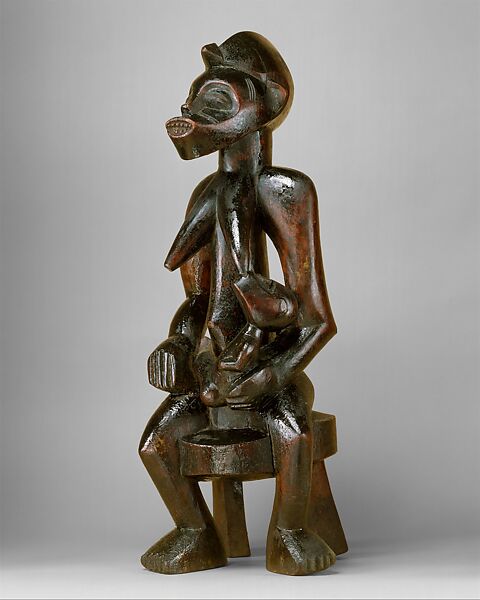 This impressive representation depicts a mother nursing an infant. The sculpture is used to honor women and their maternal role in ceremonies and festivals of the Tyekpa society, a social association among the Senufo peoples. The delicate infant strains at his mother's breast intently focused on its vital nourishment, while his mother remains stoic, steadying the baby in her left arm. The head of the mother is rendered in a rather expressionistic fashion, with pronounced mouth, large eyes, and crestlike coiffure. Her slit eyes suggest a sense of introspection and serenity as she fulfills her maternal obligations. The mother's face is further adorned with fine linear incising on the temples and cheeks, marks that are analogous to those made on Senufo women after having reached puberty. The surface of the figure is finished in a lustrous sticky patina, indicating the frequent application of oils as spiritual libations, but also to preserve the piece.