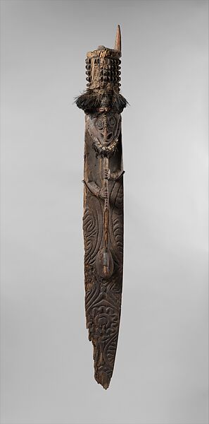 Board-like images are, or were, made in a number of areas of the Lower Sepik region. The body of this figure from the Keram River resembles the blade of a canoe paddle from whose surface a face, arms, and a phallus emerge to form a human image. This figure was almost certainly a sacred image portraying a powerful spirit or ancestor and was likely kept within the men’s ceremonial house of the village. The jaw line is embellished with cowrie shells, precious objects that served as ornaments and ceremonial currency. The figure appears to wear a headdress, adorned with cowrie shells and trimmed with the feathers of the cassowary, a large ostrich-like bird. The figure grasps a long cylindrical object, possibly representing a snake.