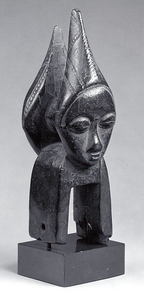 Baule peoples and their neighbors to the West, the Guro, are famous as weavers, and are known for their fine indigo-and-white cotton fabrics. Used on the traditional narrow-band loom, heddle pulleys are functional objects used to ease the movements of the heddles while separating the warp threads and allowing the shuttle to seamlessly pass through the layers of thread. Like many other carved objects used in everyday activities among the Baule, these pulleys were often embellished for the weaver’s delight. Scholars have suggested that the prominent display of pulleys, hanging over the weaver’s loom in the public place, afforded artists their best opportunity to showcase their carving skills, in the hope to attract commissions for figures and masks. This example, distinctive for its Janus representation and conical hairdos, demonstrates the efforts put by Baule carvers into beautifying the simplest functional object.