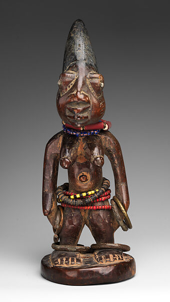 Yoruba peoples have one of the highest incidents of twin births in the world. As a result, twins are regarded as extraordinary beings protected by Sango, the deity of thunder. They are believed to be capable of bestowing immense wealth upon their families or misfortune to those who do not honor them. Powerful spirits in life, twins are honored with carved memorial figures when they die. These figures, known as ere ibeji (literally meaning ere: sacred image; ibi: born; eji: two), remain a point of access to the spirit of the departed individual. The mother provides ritual care to the figures, bathing, dressing, adorning, and feeding them. Such daily handling is responsible for giving their surface its distinctive patina. Ere ibeji invariably represent their subjects with mature adult physiognomies, and are often crowned with elaborate hairdos.