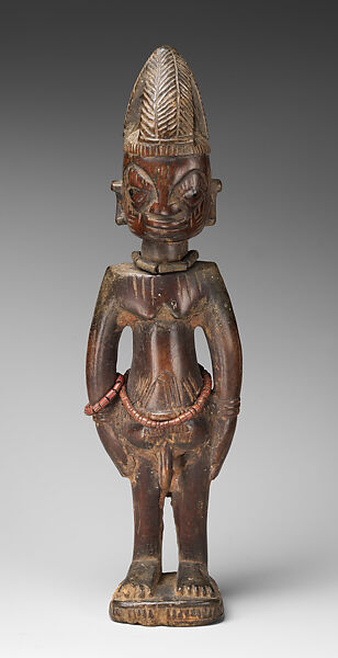 Yoruba peoples have one of the highest incidents of twin births in the world. As a result, twins are regarded as extraordinary beings protected by Sango, the deity of thunder. They are believed to be capable of bestowing immense wealth upon their families or misfortune to those who do not honor them. Powerful spirits in life, twins are honored with carved memorial figures when they die. These figures, known as ere ibeji (literally meaning ere: sacred image; ibi: born; eji: two), remain a point of access to the spirit of the departed individual. The mother provides ritual care to the figures, bathing, dressing, adorning, and feeding them. Such daily handling is responsible for giving their surface its distinctive patina. Ere ibeji invariably represent their subjects with mature adult physiognomies, and are often crowned with elaborate hairdos.