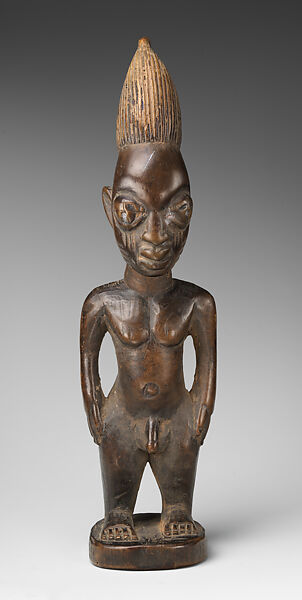 Yoruba peoples have one of the highest incidents of twin births in the world. As a result, twins are regarded as extraordinary beings protected by Sango, the deity of thunder. They are believed to be capable of bestowing immense wealth upon their families or misfortune to those who do not honor them. Powerful spirits in life, twins are honored with carved memorial figures when they die. These figures, known as ere ibeji (literally meaning ere: sacred image; ibi: born; eji: two), remain a point of access to the spirit of the departed individual. The mother provides ritual care to the figures, bathing, dressing, adorning, and feeding them. Such daily handling is responsible for giving their surface its distinctive patina. Ere ibeji invariably represent their subjects with mature adult physiognomies, and are often crowned with elaborate hairdos.