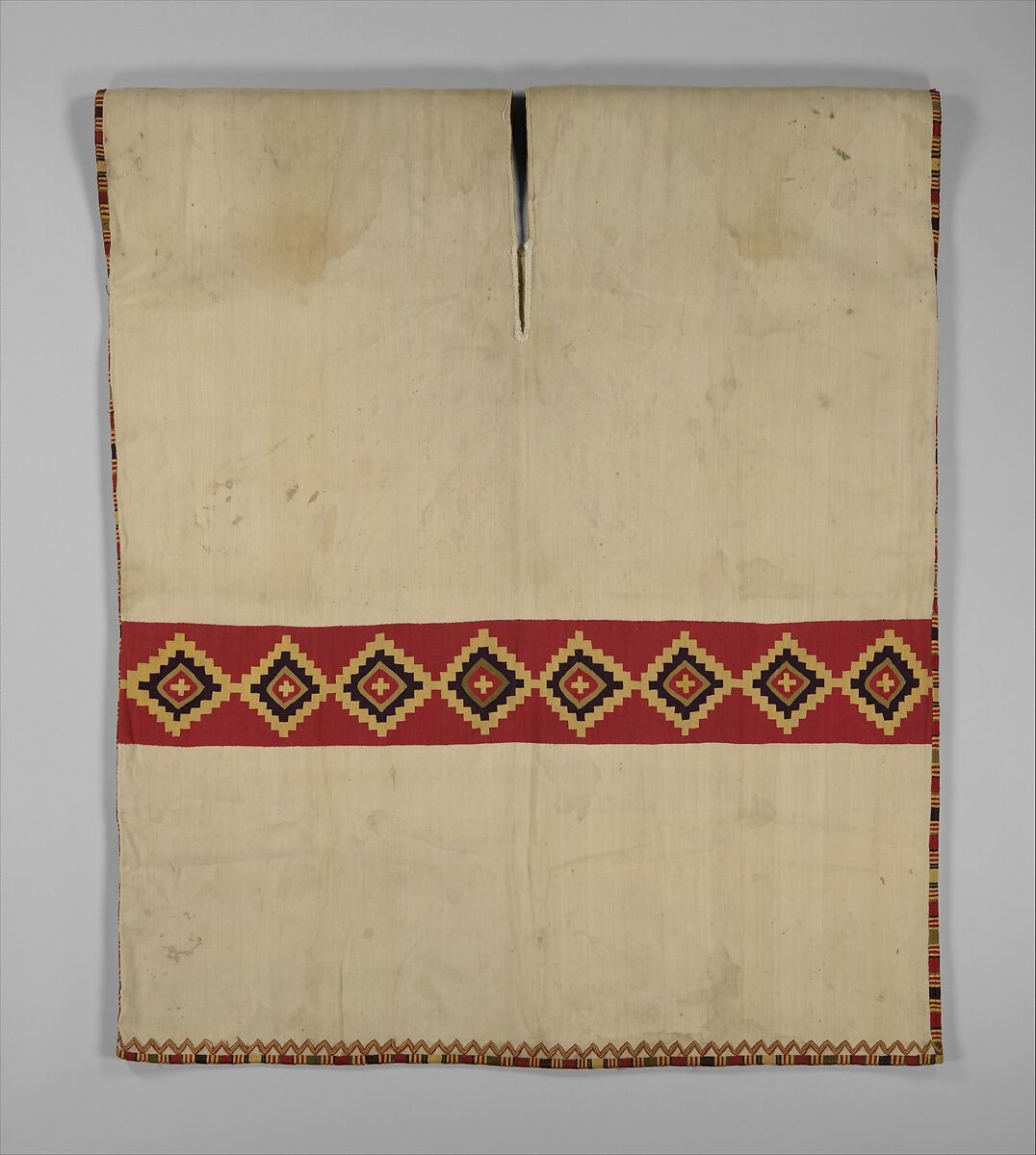 Tunics with a diamond-pattern at the waist are one type of some half-dozen standardized designs known from the Inca Empire, the polity that dominated much of western South America in what is known as the Late Horizon period (AD 1470–1532). This tunic features a white ground interrupted by a red band at the waist containing eight stepped diamond shapes on each side. White tunics were particularly highly esteemed by the Incas, as white camelids were comparatively rare in the Andes.