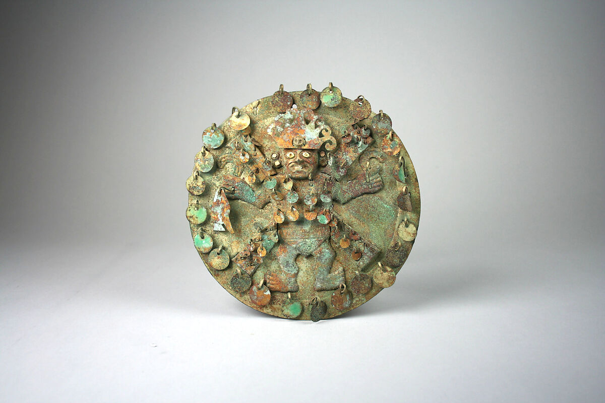 This gilded and silvered copper disk, featuring a central figure with arms outstretched, was produced by artisans of the Moche culture in northern Peru. The sophisticated combination of silver and gold and the understanding of the complex processes needed to achieve these effects are hallmarks of Moche metalworking, perhaps the most advanced in all of the ancient Americas. The central gilded figure and the four radiating bands were each made separately and attached to the circular silvered disk via small tabs.