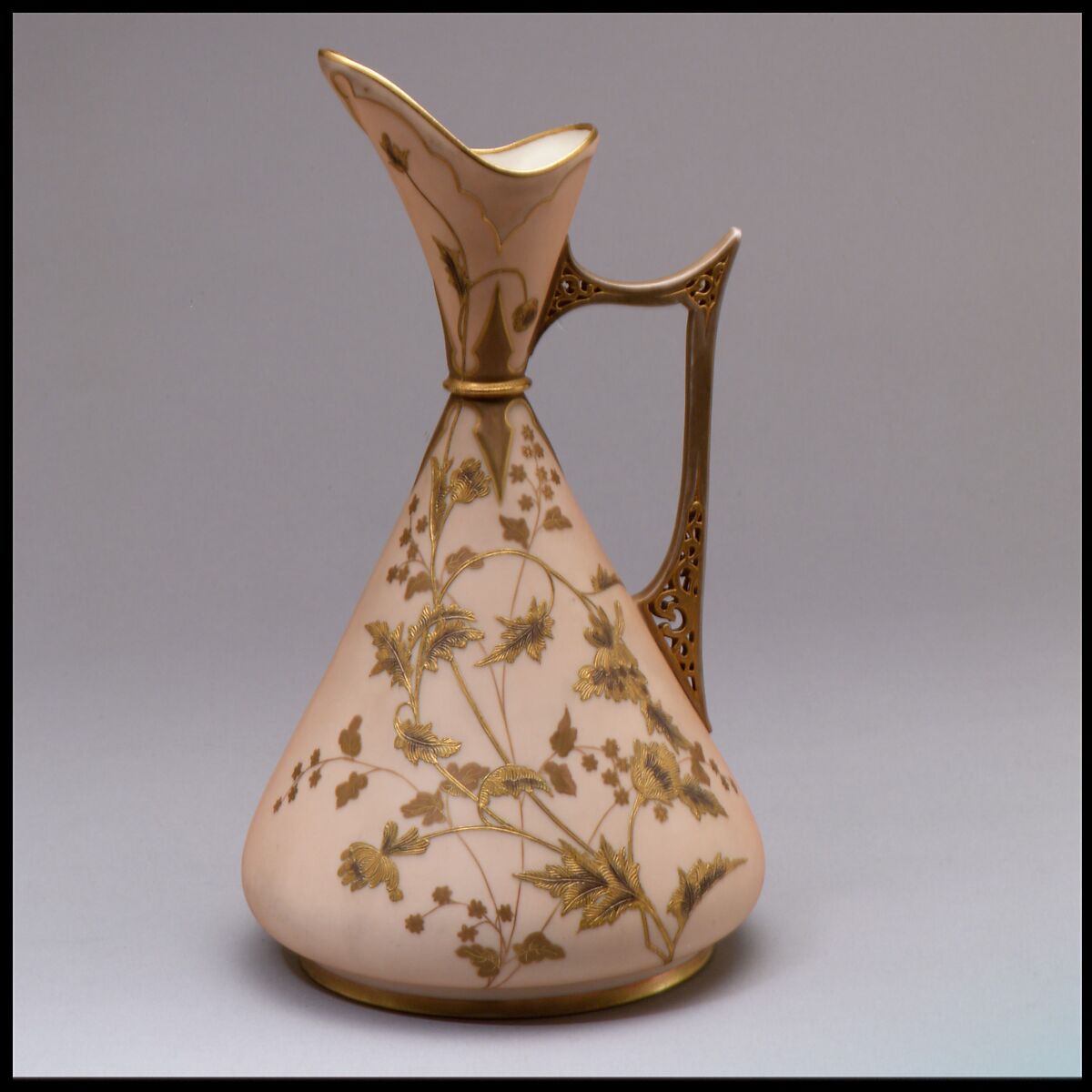 Set against a matte peach-colored ground, applied gold decoration of sinuous grasses and leaves decorates this elegant ewer made by the Greenwood Pottery. In the last two decades of the nineteenth century, Greenwood became a prominent manufacturer of artistically designed porcelain. They took the Worcester Royal Porcelain Works in England as their chief inspiration, emulating the English firm’s interest in East and West Asian design idioms, and hiring several of the company’s former employees.