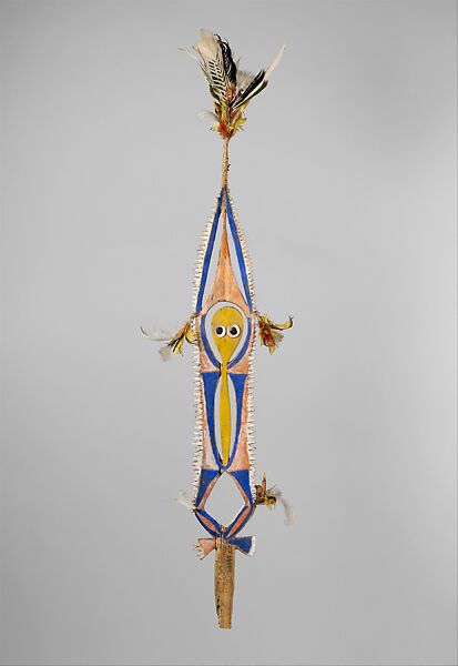 The Tolai people of northern New Britain create a great variety of ceremonial paraphernalia known collectively as pokopoko, which are worn or carried during dances and other performances. This work is a dance wand (bair). Bair are carried in pairs by men during a dance known as kulau (young coconut). However, the name of these objects changes with their context. They are called bair only when in use. When not in use, they are kept inside a sacred house and are called simply pokopoko (ceremonial paraphernalia). Bair and other dance accessories are made, or designed, by tena buai, men and women initiated into the sacred knowledge of music. The central images represent spirits (tabalivana). The spirit image is often highly stylized but must include at least one recognizable anatomical feature, such as eyes or a limb. In this wand, the spirit is shown nearly complete, with prominent eyes, a slender body, flexed legs, and out-turned feet with numerous delicate toes.