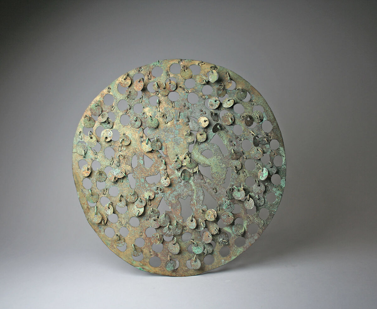 The use of disks such as the present example is unclear. They may have served as shield frontals, attached to a cane backing, now lost. The delicate nature of this metal ornament would have provided little physical protection in battle, but the imagery itself may have been thought to have certain apotropaic qualities. Alternatively, these disks may have been attached to textile banners or some other type of object.