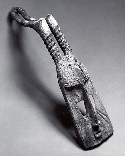 This kanaga mask was collected in Mali by Lester Wunderman, complete with its costume elements (see 1987.74a-i). When the mask is worn, the back of the dancer's head is covered with a hood of plaited fiber fringe at the bottom edge. The dancer wears a vest made of black strip-woven cloth and red broadcloth strips embroidered with white cowrie-shells; strands of glass and plastic beads dangle from its edges. The kanaga dancer also wears a pair of trousers made of indigo-dyed, strip-woven cotton cloth, over which he ties a long skirt of curly, loosely strung, black-dyed sanseveria fibers and short overskirts of straight red and yellow fibers. For a traditional dama, the preparation and dyeing of the fibers are undertaken with as much secrecy and ritual as the carving of the wooden mask.