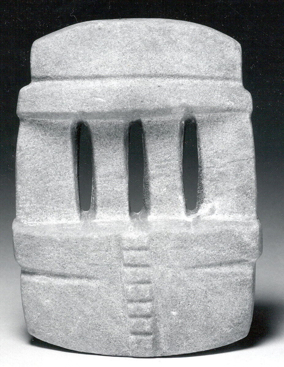 Mezcala models may have served multiple functions over time, in keeping with the Mesoamerican custom of repurposing or re-carving stone objects. Oblong-shaped models (see MMA 1994.35.704), or ones with curved bases (see MMA 1994.35.633), for example, may have been re-carved from celts, ritual tools of great symbolic importance. Several have holes drilled into the base, which could have been used to fasten them with fiber to a larger item such as a ritual bundle, a practice widely known in archaeological and ethnographic contexts in Mesoamerica (see MMA 1994. 35.700). Offerings of Mezcala stone objects in the Templo Mayor, the sacred center of the Aztec capital, Tenochtitlan, built between 1325 and 1519, underscore the importance of these works as a continuation of tradition, as heirlooms, or as emulations of an ancient style.