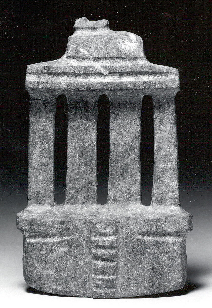 Stone architectural models in the Mezcala style primarily come from the present-day state of Guerrero in southwest Mexico. A particularly long-lived tradition, these works may have been produced over some one thousand years, beginning as early as 500 BCE. Little is known about their archaeological contexts, and there are few points of reference with surviving architecture in the region. It is possible that models with pillars reference buildings with stone columns, such as those from Cuetlajuchitlán.