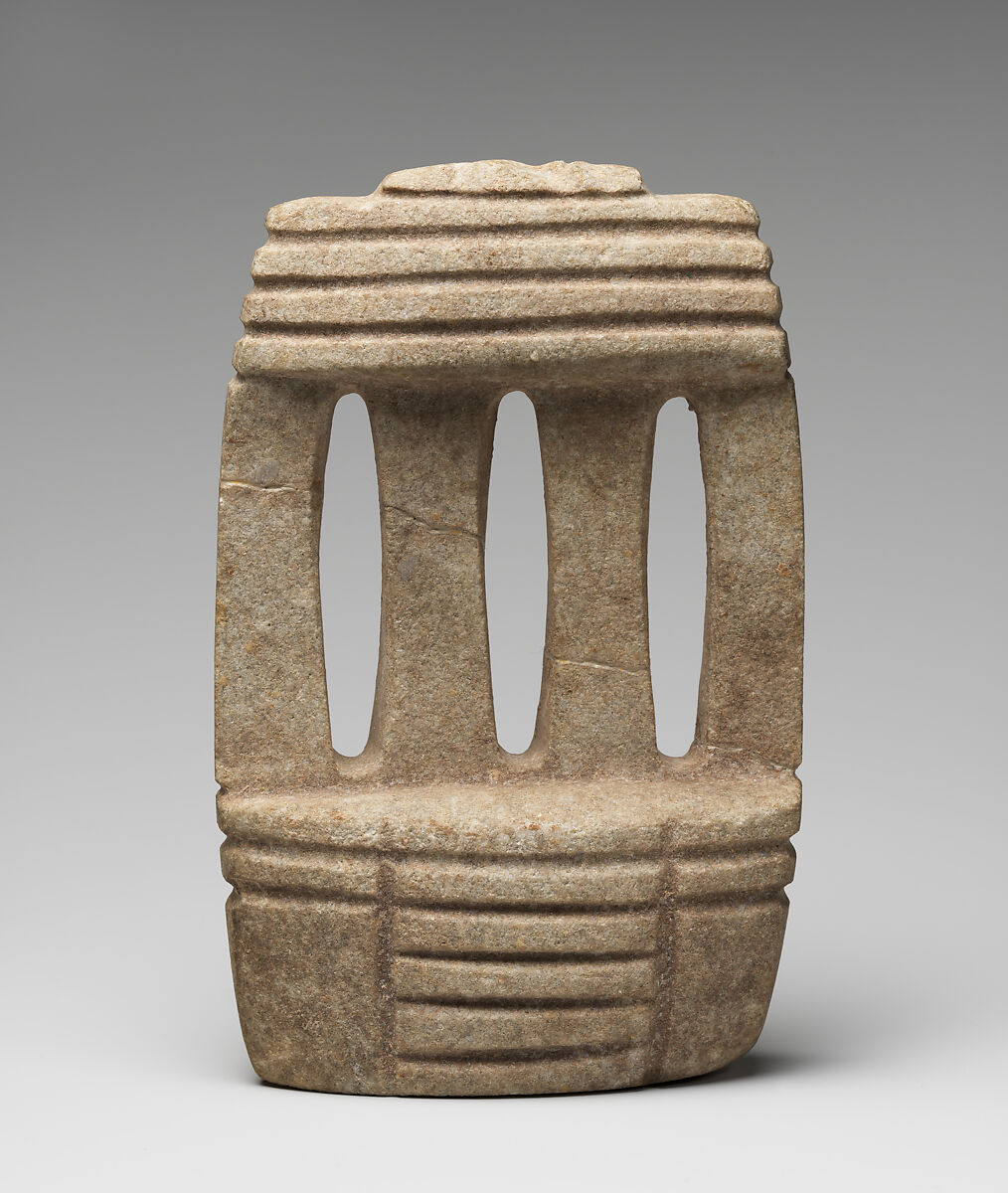 Mezcala models may have served multiple functions over time, in keeping with the Mesoamerican custom of repurposing or re-carving stone objects. Those with curved bases may have been re-carved from celts, ritual tools of great symbolic importance (see MMA 1979.206.525). Several others have holes drilled into the base, which could have been used to fasten them with fiber to a larger item such as a ritual bundle, a practice widely known in archaeological and ethnographic contexts in Mesoamerica (see MMA 1994. 35.700). Offerings of Mezcala stone objects in the Templo Mayor, the sacred center of the Aztec capital, Tenochtitlan, built between 1325 and 1519, underscore the importance of these works as a continuation of tradition, as heirlooms, or as emulations of an ancient style.