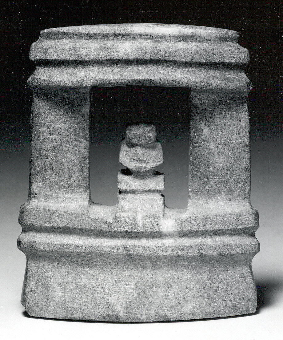 Mezcala models may have served multiple functions over time, in keeping with the Mesoamerican custom of repurposing or re-carving stone objects. Oblong-shaped models (see MMA 1994.35.704), or ones with curved bases (see MMA 1994.35.633), for example, may have been re-carved from celts, ritual tools of great symbolic importance. Several have holes drilled into the base, which could have been used to fasten them with fiber to a larger item such as a ritual bundle, a practice widely known in archaeological and ethnographic contexts in Mesoamerica (see MMA 1994. 35.700). Offerings of Mezcala stone objects in the Templo Mayor, the sacred center of the Aztec capital, Tenochtitlan, built between 1325 and 1519, underscore the importance of these works as a continuation of tradition, as heirlooms, or as emulations of an ancient style.