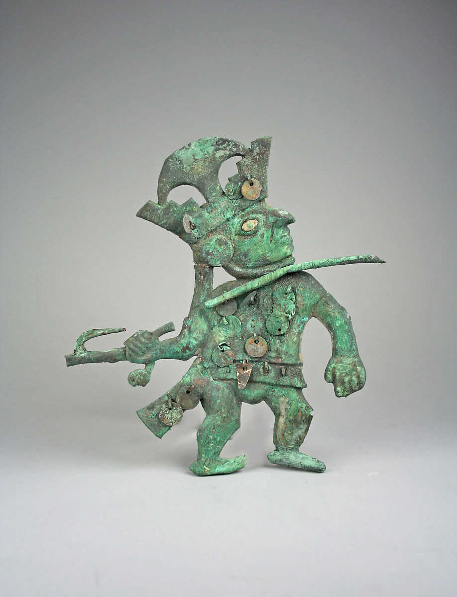 This warrior, one of five highly similar gilded copper figures in the collections of The Metropolitan Museum of Art (the others are accession numbers 1987.394.71, .72, .85, .86), was created by artists of the Moche culture in northern Peru. Each figure has a spear thrower or atlatl in his hand, and each wears typical Moche warrior regalia including a distinctive headdress tied under the chin and surmounted by a metal crescent projecting upward between two stepped elements. The warriors wear a tunic and loincloth as well as ear ornaments and a backflap, a type of body armor suspended from the lower back and terminating in a row of conical metal bells (missing on the present example). Bells of similar shape suspended from tunics and banners have been excavated at Moche sites such as Sipán, reminding us of the importance of sound in battles, processions, and performances (Alva and Donnan, 1993).