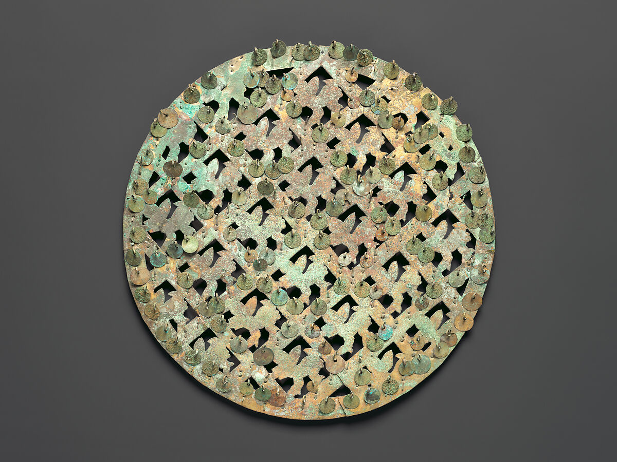 The wires that hold the dangles are oriented so that only when the disk is in the proper position do the ornaments hang within the circumference of the gilded copper disk. (In any other orientation, some dangles would hang beyond the edges of the disk.) The use of disks such as the present example is unclear. They may have served as shield frontals, attached to a cane backing now lost. The delicate nature of the metal ornament would have provided little physical protection in battle, but the imagery itself may have been thought to have certain apotropaic qualities. Alternatively, these disks may have been attached to textile banners or some other type of object.
