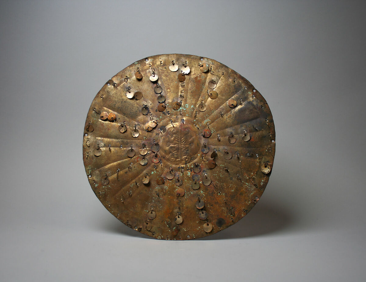 This gilded copper disk, made by artists of the Moche culture in northern Peru, was originally cut from a larger sheet of hammered copper and then gilded (Schorsch, 1998). Two creatures, rendered in repoussé, face each other in the roundel in the center of the disk, and embossed rays of two different widths extend from the center to the outer rim. Within each of the narrower rays, circular gilded dangles hang from thin wires attached at the back. Several perforations along the outer rim of the disk may have been used with threads to bind the object to a backing. Most of the metal is now covered with a slight patina as well as a few points of corrosion, but one can imagine how, when first made, this piece must have reflected the sunlight, creating a dazzling display of movement and light.