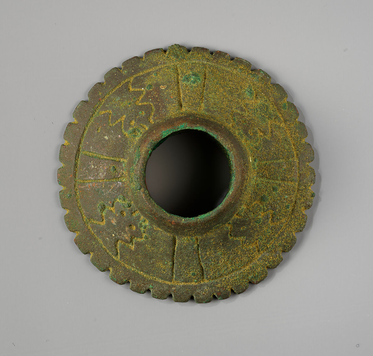 This cast copper mace head was made by a metalsmith of from the Vicús culture of Peru’s far north coast. Vicús mace head designs range from simple geometrical shapes to animal heads (Carcedo, 1999: 428-4431; 438-439). This weapon has a surface divided by incisions into four sections with an abstract bird or fish-like design, as well as a dentillated edge and an undecorated bottom. The narrow edge of this shape produced considerably more pressure than round or bulbous forms when struck against a victim. Some mace heads were gilded after casting and may have been made only for rituals or for internment as the gilding probably would not have withstood the rigors of battle.