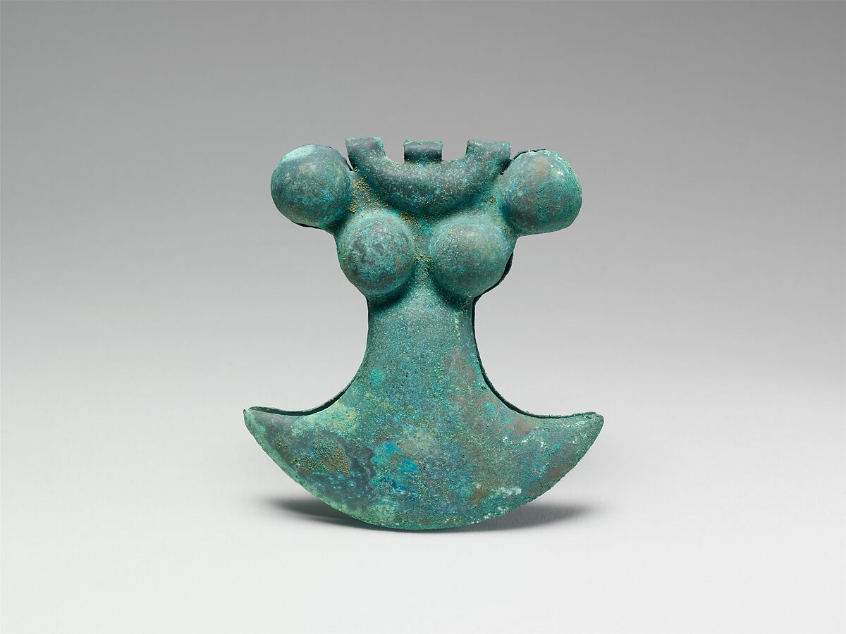 This small hollow ornament is made of a hammered copper sheet folded along the top. Similar ornaments are illustrated in Moche art, attached to the belts of warriors. Here, three suspension loops allowed the object to be attached. The inverted crescent shape of the object recalls the form of tumi knives used in sacrifice ceremonies. The ornament is also identical to metal backflaps illustrated in Moche iconography and discovered in the royal burials at the site of Sipán, on the north coast of Peru. Backflaps were symbolic objects; often tumi-shaped and half silver, half gold, they expressed ideas of sacrifice and dualism. As backflaps, this ornament includes a series of hollow spheres containing clappers that produced sound when the wearer moved.