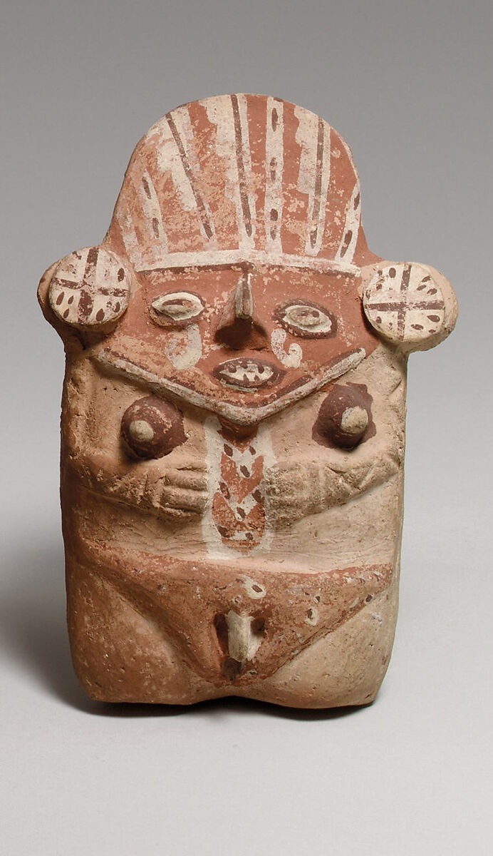 After the influence of Wari waned, several ceramic styles evolved on the Pacific coast that emphasized mass production and the fabricating use of molds and stamps. In the valleys north of Lima, the Chancay people produced ceramics that are very distinctive in form and decoration. Painted predominantly in dark brown-black on white, the ceramics appear sloppy by comparison with many earlier and contemporary styles. However, the spontaneity of the decoration, the restrained color scheme, and the often bold painting lend the Chancay wares considerable charm. In addition to vessels, Chancay potters produced ceramic sculptures of humans and animals. Human figures, often made in explicitly male-female pairs, originally must have worn clothing. These two could have been made in the same basic mold with specific anatomical and decorative details added by hand. Both figures wear the same round ear ornaments—those of the female are bigger—but different headdresses. The corner-pointed hat worn by the male figure implies Wari influence since such hats were typical of Wari costume.