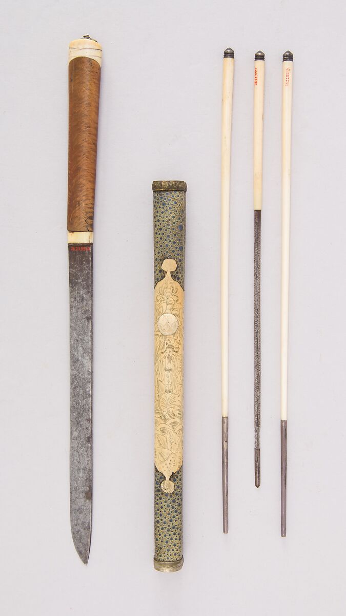 - Dimensions: Knife (a); L. with sheath 12 7/16 in. (31.6 cm); L. without sheath 11 1/2 in. (29.2 cm); W. 3/4 in. (1.9 cm); Wt. 2 oz. (56.7 g); sheath (b); Wt. 0.9 oz. (25.5 g); chopsticks (c, d); L. 10 5/8 in. (27 cm); W. 1/4 in. (0.6 cm); Wt. 0.3 oz. (8.5 g); pickle spear (e); L. 9 9/16 in. (24.3 cm); W. 1/4 in. (0.6 cm); Wt. 0.3 oz. (8.5 g); pick (f); L. 3 5/8 in. (9.2 cm); small pick (g); L. 1 3/4 in. (4.5 cm)