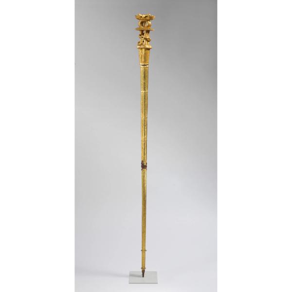 Incorporating highly symbolic motifs drawn from the vast visual repertoire of the Akan peoples of Ghana, this golden staff (ȯkyeame poma) is unique for its association with both British colonialism and Ghanaian independence.