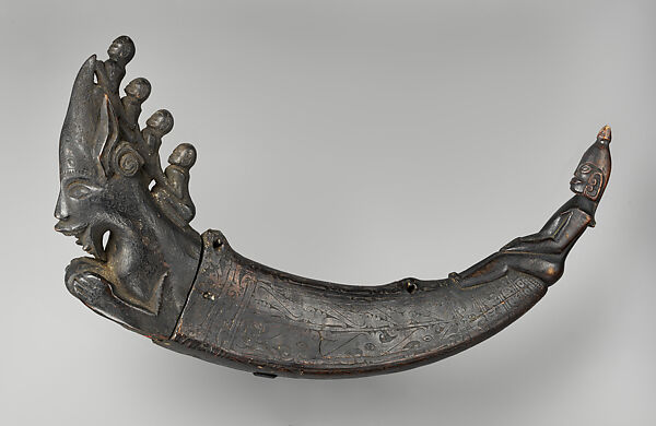 The horn's pointed end is carved in the form of a seated human figure. The wider, open end is plugged with an elaborate wooden stopper that depicts the singa (a zoomorphic underworld deity) with four human figures riding on its back. These human figures may represent the succession of ritual masters who preceded the datu who owned the container. It is also possible that the figures are related to mythical characters portrayed on other ritual implements.
