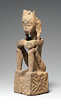 Throughout the islands of Maluku Tenggara in eastern Indonesia, ancestor images indicated important links between the living and the dead. Small seated ancestor figures depicted deceased family members and were kept and used within the home. The present image is likely from Leti Island, where such images were called yene. Each depicted a specific recently deceased individual and served as a vessel in which his or her spirit resided temporarily before departing for the land of the dead and to which it periodically returned to receive offerings or be consulted about important matters. On Leti, the pose of yene indicated the gender and status of the deceased. Male ancestors were shown seated with the legs drawn in to the body, and female ancestors were depicted with the legs crossed.