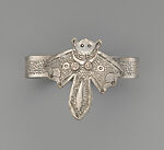 After 1894, when Abomey, the capital of the Fon Kingdom, came under French colonial rule, metalsmiths created many objects of personal adornment for a new Fon ruling class, some of whom by then were colonial officials appointed by the French. Silver arm bands, bracelets, and headbands made of metal alloys including copper, zinc, and silver were constructed of multiple elements joined by loops, chains, and wire. The assemblages sometimes included small sculptures of umbrellas, canons, animals, dangling European coins, and (in later years) airplanes and automobiles. On this bracelet, the image of a bat peering over what looks like a French fleur-de-lis is an example of how the artists combined local and imported imagery into novel objects.