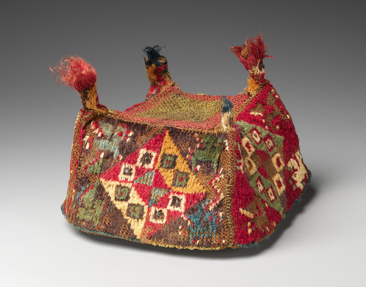 Finely woven, brightly colored hats, customarily featuring a square crown, four sides, and four pointed tips, are most frequently associated with two ancient cultures of the Andes: the Wari and the Tiwanaku. The Wari Empire dominated the south-central highlands and the west coastal regions of what is now Peru from 500–1000 A.D. The Tiwanaku occupied the altiplano (high plain) directly south of Wari-populated areas around the same time, including territory now part of the modern country of Bolivia. The cultures not only developed and flourished as contemporaries, but also occupied adjacent lands for nearly four centuries. A Wari ceremonial center called Cerro Baúl was located a mere five miles from Tiwanaku-settled fields in the Moquegua Valley of Peru. The two cultures likely encountered each other at Cerro Baúl and elsewhere, but the nature of these interactions remains largely unknown.